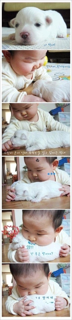 아기들있는집에서는멍멍이키우면안되는데, 멍멍이도힘들고(아기가이뻐하는게, 강아지한텐 괴롭히는거나다름없으니깐) 아기한테도해롭고(털이나 배설물등의 위생상,, ) ..) 귀엽다..emoticon_004
