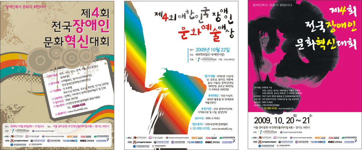 캘리 부탁좀 드려도 될까요? 길선진 일반 3 6029 2009.05.19 11:03 포스터에 제목을 좀 쓰려고 하는데요!!! 제4회 전국장애인문화혁신대회, 제4회 대한민국장애인문화예술대상 요렇게 두개만.. 부탁좀..드리겠습니다. -------------------------------------- 2절 포스터에 사용할 캘리입니다. 대충 컨셉은 첨부파일 정도로 하려고 합니다^^아직 수정하고 있는 단계라.. 미흡한 점이 많습니다.... 예인님 제가 미쳐 글을 보지못했네요^^ 죄송합니다!! 필요한거는 요번주 안으로다가 되면 좋겠지만... 바쁘시다면...조금 늦어져도 상관은 없습니다. 도와주세요~~~~